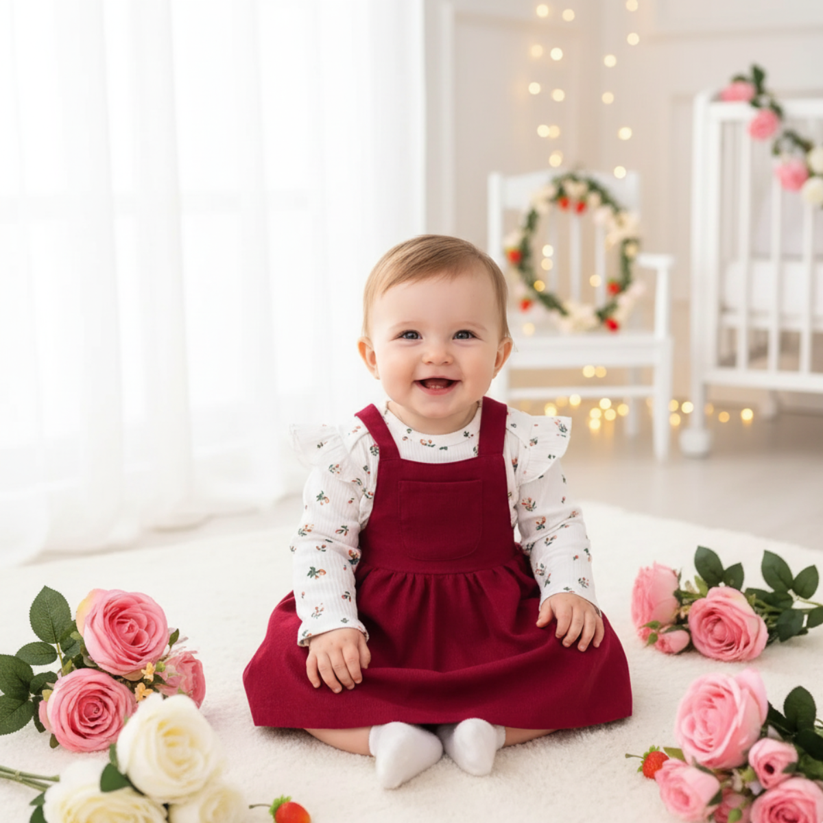 The Royal Blossom Set is more than just clothing – it’s an invitation to create cherished moments with your little princess. From the delicate floral bodysuit to the elegant ruby straps, every detail has been crafted to bring together comfort, beauty, and sophistication in a timeless piece.